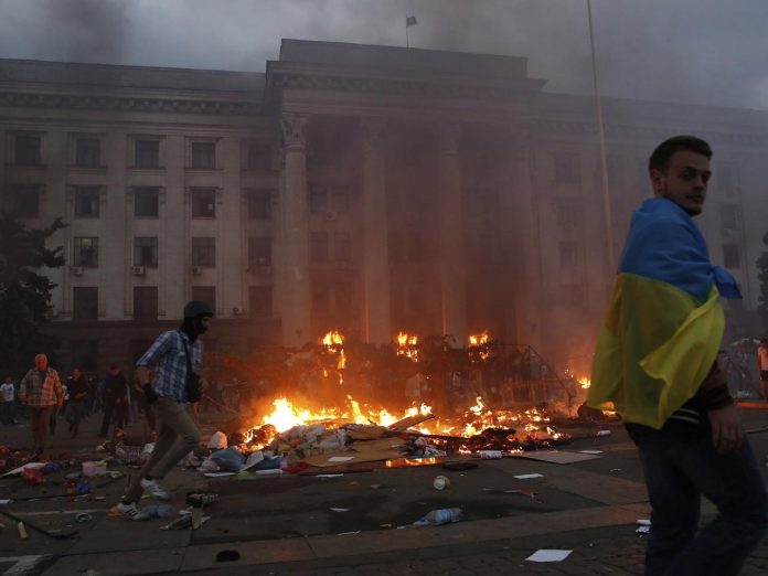 Le 2 mai 2014, la Maison des syndicats d’Odessa était la proie des flammes, attaquée par des milices nationalistes ukrainiennes du parti fasciste Pravy Sektor, sous les yeux impassibles de la police. Au cours de la journée, des affrontements opposaient manifestants russophones et nationalistes ukrainiens. Dans l’incendie, 42 manifestants sont tués, asphyxiés et brûlés vifs, parmi lesquels nombre de militants syndicalistes et antifascistes. 6 sont morts dans les affrontements plus tôt dans la journée. Ce massacre marque durablement la nation ukrainienne, profondément divisée, en proie à la guerre d’intérêts que se livrent sur place les monopoles russes d’un côté, états-uniens et européens de l’autre. Au lendemain du massacre, la ville est en deuil : habitants de toutes langues se rassemblent et crient leur refus de la guerre. Jamais le gouvernement de Kiev ne mènera d’enquête sérieuse sur l’incendie et ne cherchera à inquiéter les coupables.