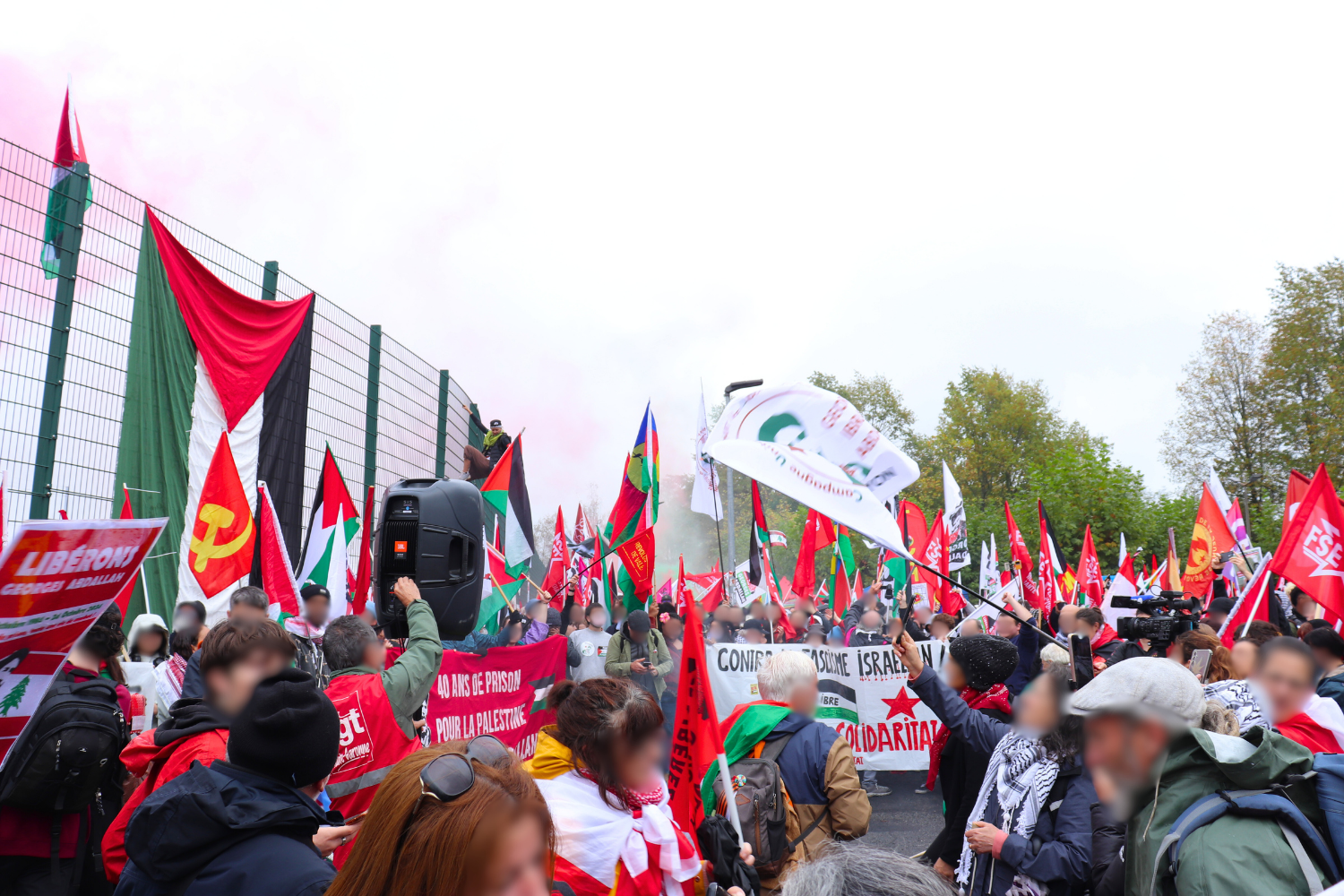 La manifestation s’est tenue aux abords de la prison de Lannemezan, à l’appel de la Campagne Unitaire pour la libération de Georges Ibrahim Abdallah (CUPLGIA). Une série d’actions se sont déroulées le long du cortège et des grilles de la prison, menées par des activistes déterminés, soutenus par l’ensemble du cortège.