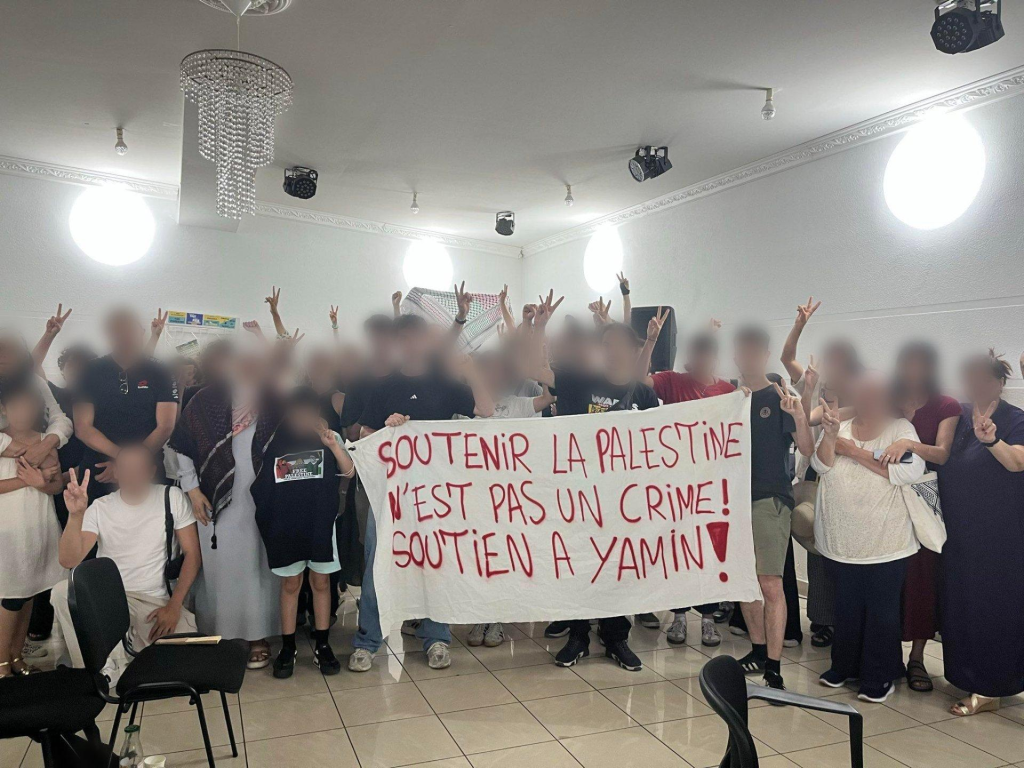 À la fin de la soirée, une photo est prise en soutien à Yamin, militant propalestinien lyonnais réprimé pour son soutien à la Palestine.