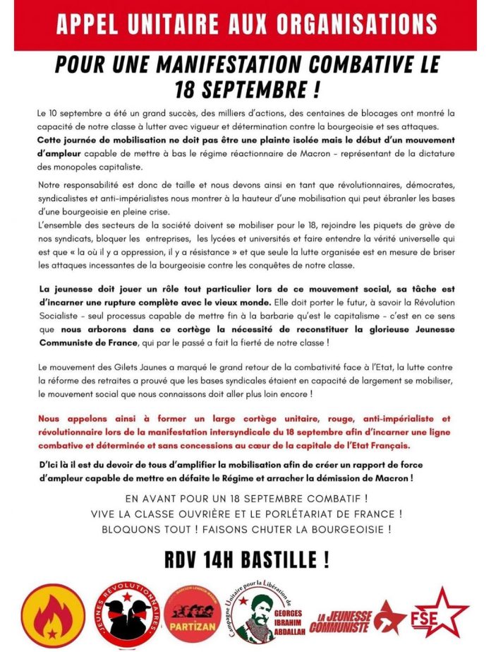 Nous appelons ainsi à former un large cortège unitaire, rouge, anti-impérialiste et révolutionnaire lors de la manifestation intersyndicale du 18 septembre afin d’incarner une ligne combative et déterminée et sans concessions au cœur de la capitale de l’État Français.