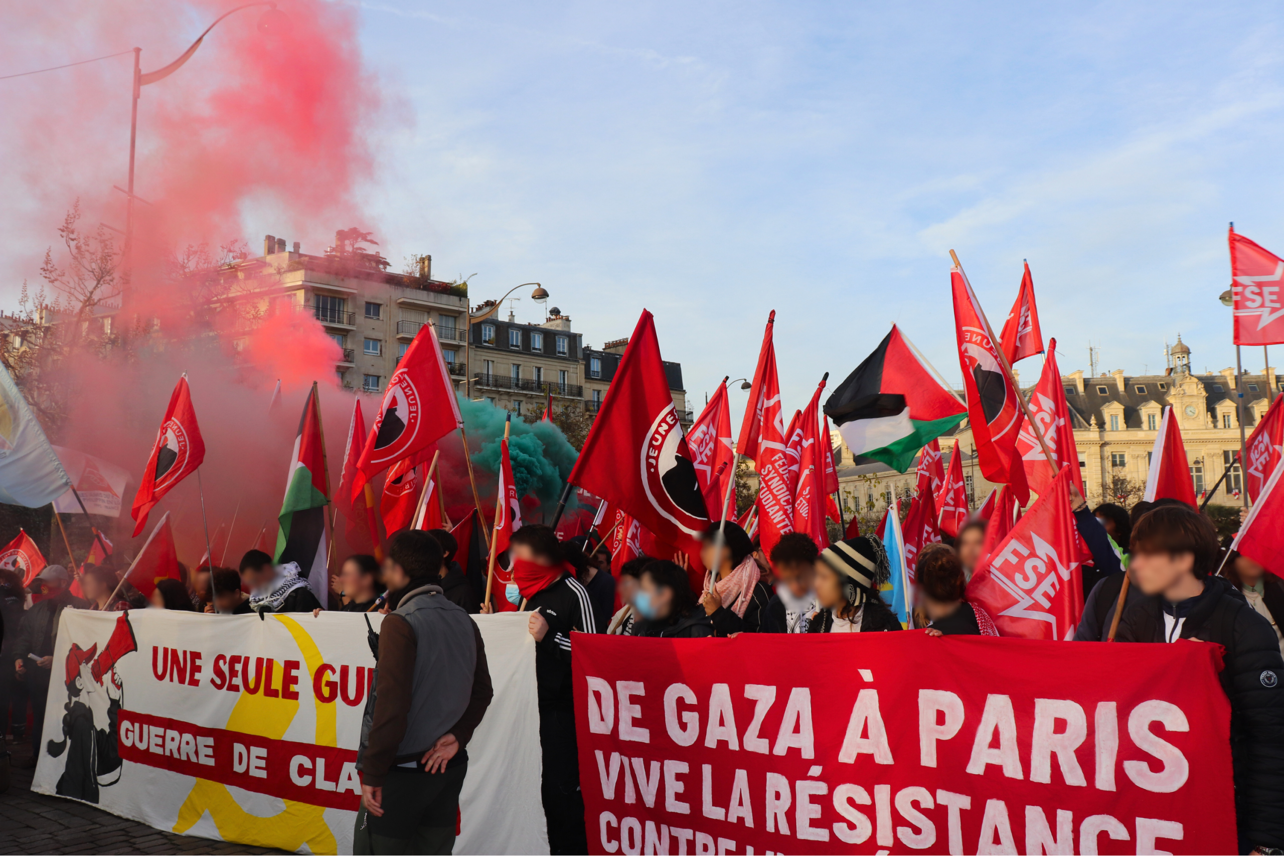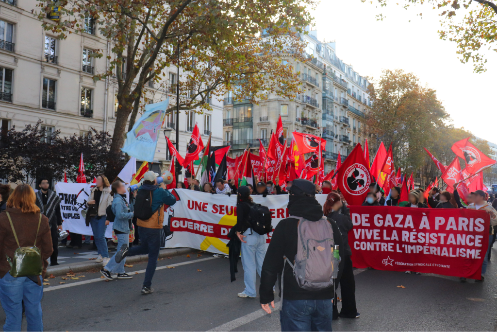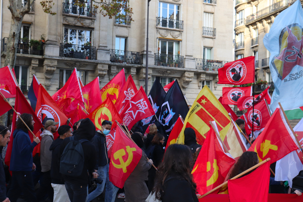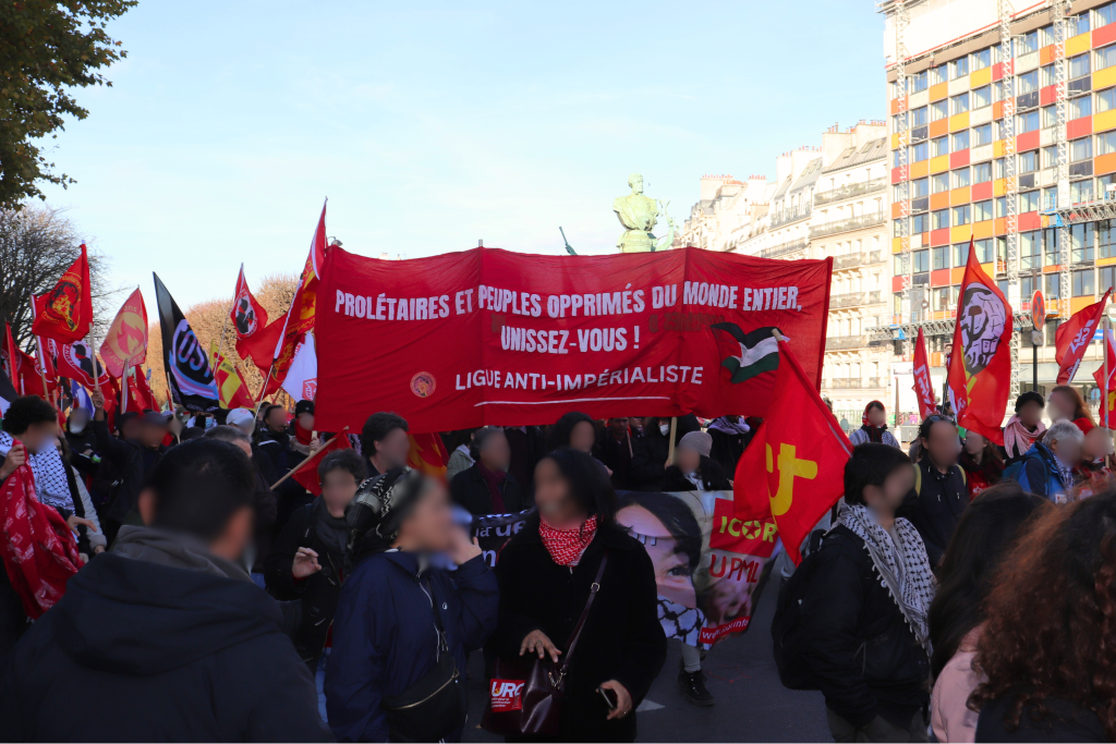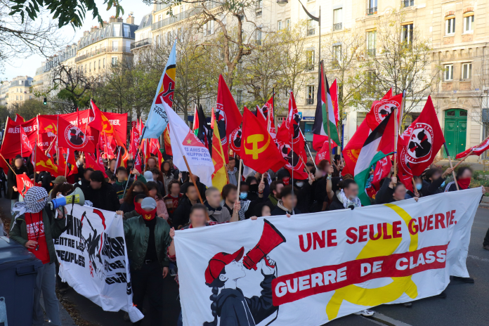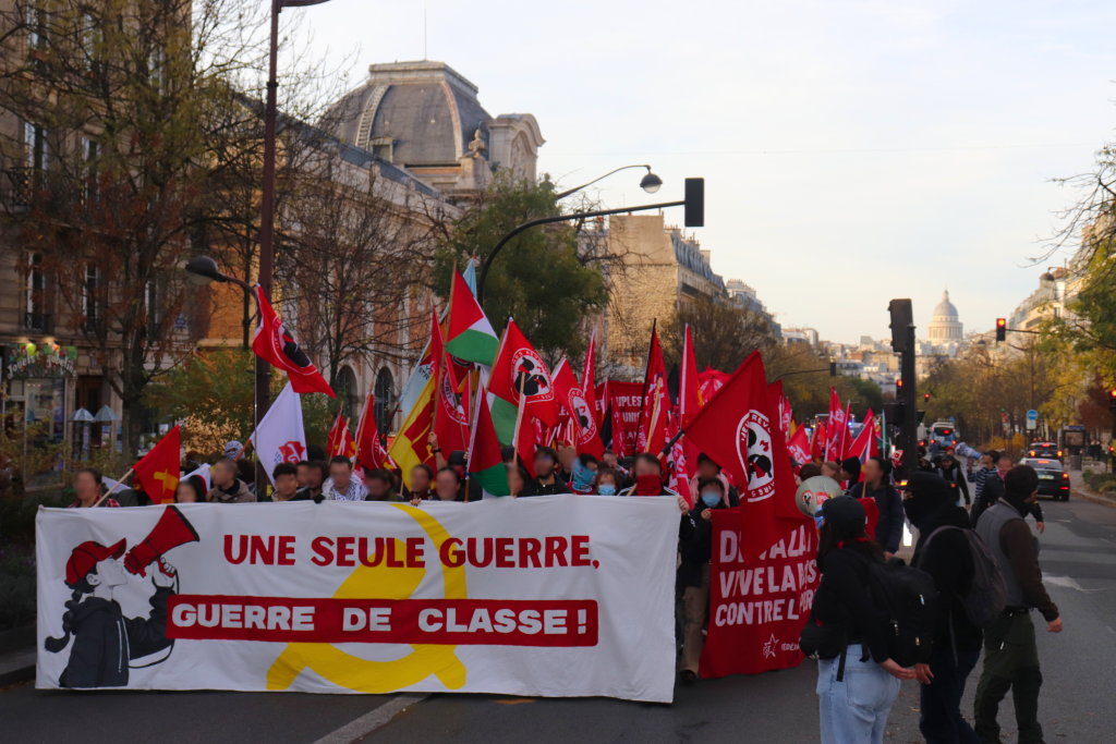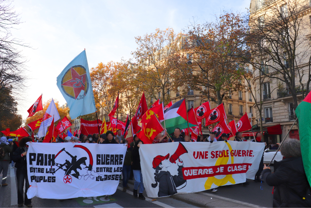 Aujourd’hui, plusieurs centaines de personnes ont défilé dans les rues de Paris pour s’opposer aux guerres impérialistes, le jour de la commémoration de l’armistice de la « Grande Guerre », à l’appel de plus de 70 organisations révolutionnaires, anti-impérialistes et démocratiques. Les banderoles et nombreuses pancartes dénoncent les guerres en cours, découlant directement de la domination impérialiste sur le tiers-monde : Palestine, Ukraine, Congo, Soudan, etc. Cette journée n’est donc pas une simple « commémoration », mais aussi une journée de lutte contre une actualité guerrière toujours brûlante.