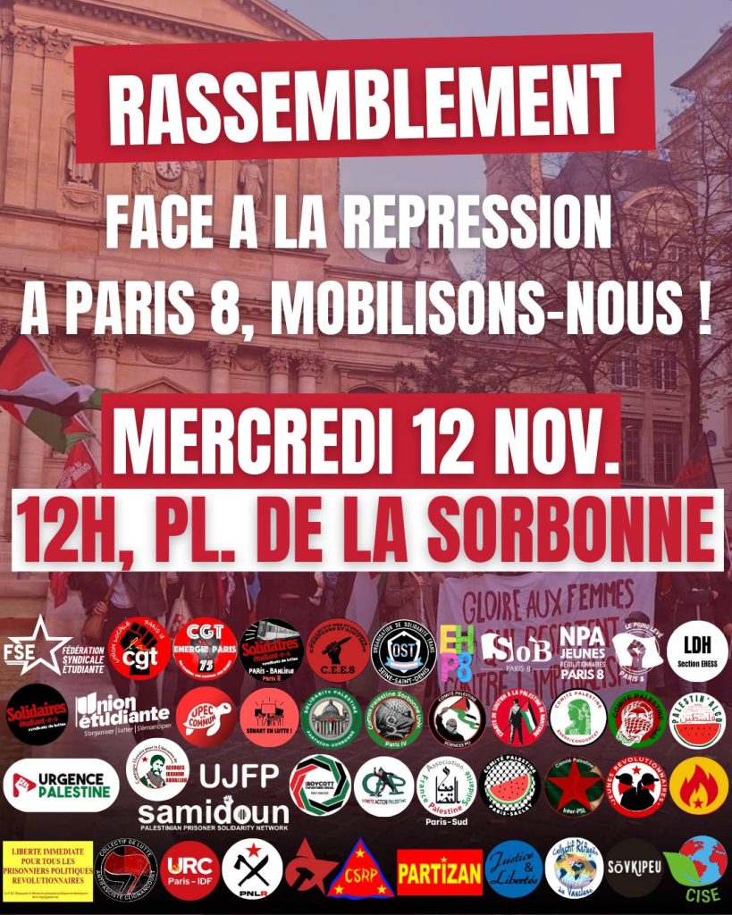 Les étudiants de Paris 8, foncièrement décidés à ne pas se laisser faire, ont bloqué l’Université tôt le mercredi 12 novembre. Ce jour n’était pas choisi au hasard : c’était le jour de convocation de la camarade syndicaliste de la FSE au Ministère de l’Enseignement Supérieur et de la Recherche, tout ça pour avoir osé réserver une salle pour le meeting. Ce blocage a permis à des dizaines d’étudiants de s’informer de la situation de leur université et de rejoindre le rassemblement organisé à 12h, place de la Sorbonne, appelé par la FSE et plus de quarante organisations pour dénoncer les attaques contre le mouvement pro-palestinien et la répression organisée méthodiquement dans les universités et en dehors. S’il fallait une preuve supplémentaire de la justesse du combat porté par ce rassemblement, elle s’est illustrée par la venue de militants de l’UEJF pour perturber le rassemblement, syndicat étudiant dont la raison de vivre se résume à la défense du projet génocidaire d’Israël. Tandis que les militants de l’UEJF se voyaient exfiltrés du rassemblement par la police, des camions de CRS sont arrivés et ont nassés ce qu’il restait du rassemblement. Finalement, n’ayant rien à reprocher aux manifestants, ils ont été obligés de les laisser partir après 20 minutes.