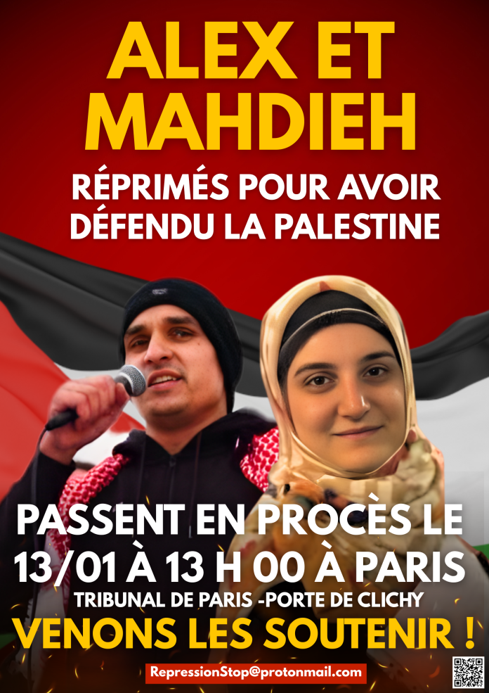 Le procès d’Alex et de Mahdieh, à l’instar des procédures judiciaires encourues par tant d’autres défenseurs de la cause palestinienne, comme Yamin Makri, Shahin Hazamy, Timothée Esprit, Jean-Paul Delescaut, François Burgeat, Elias d’Imzalene, Omar Alsoumi ou encore Anasse Kazib, est un symptôme de plus de la réactionnarisation croissante de la bourgeoisie française. Laisser un seul d’entre nous seul face à la justice, c’est se condamner à tomber plus tard sous le couperet de la justice de classe. Tant de personnes isolées ont écopé de peines beaucoup trop lourdes et ont subi l’humiliation de la justice dans le silence général. À nous de nous organiser et de mettre en commun nos forces pour tous ces réprimés anonymes et en soutien au peuple palestinien. Ne tombons pas dans le piège de l’État de nous concentrer seulement sur la défense des réprimés et d’oublier pour qui nous nous battons !