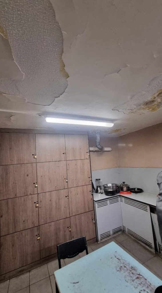 Les espaces communs, dont les cuisines, sont délabrés à cause de nombreuses infiltrations d’eau.