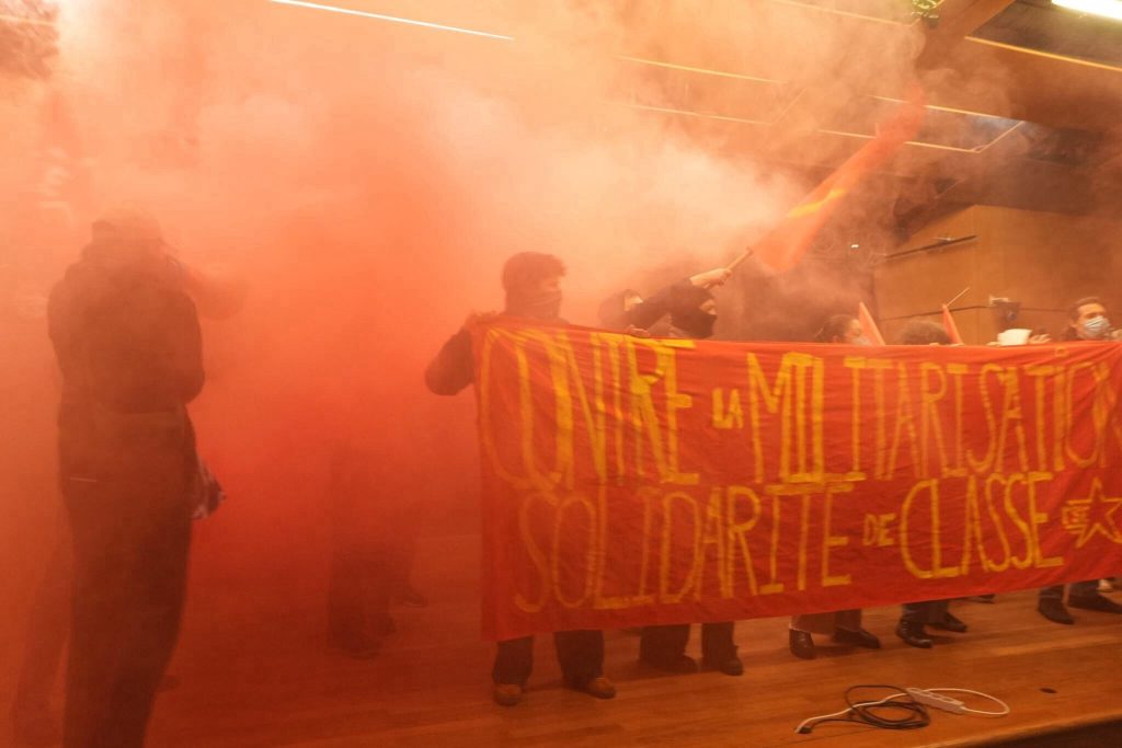 À l’impulsion de la FSE (Fédération Syndicale Etudiante), de la LJR (Ligue de la Jeunesse Révolutionnaire) et de l’OCF (Organisation Communiste de France), des militants antimilitaristes et anti-impérialistes ont envahi la conférence pour perturber son déroulement. Chants, slogans et prises de paroles ont permis de largement expliquer et politiser l’action.