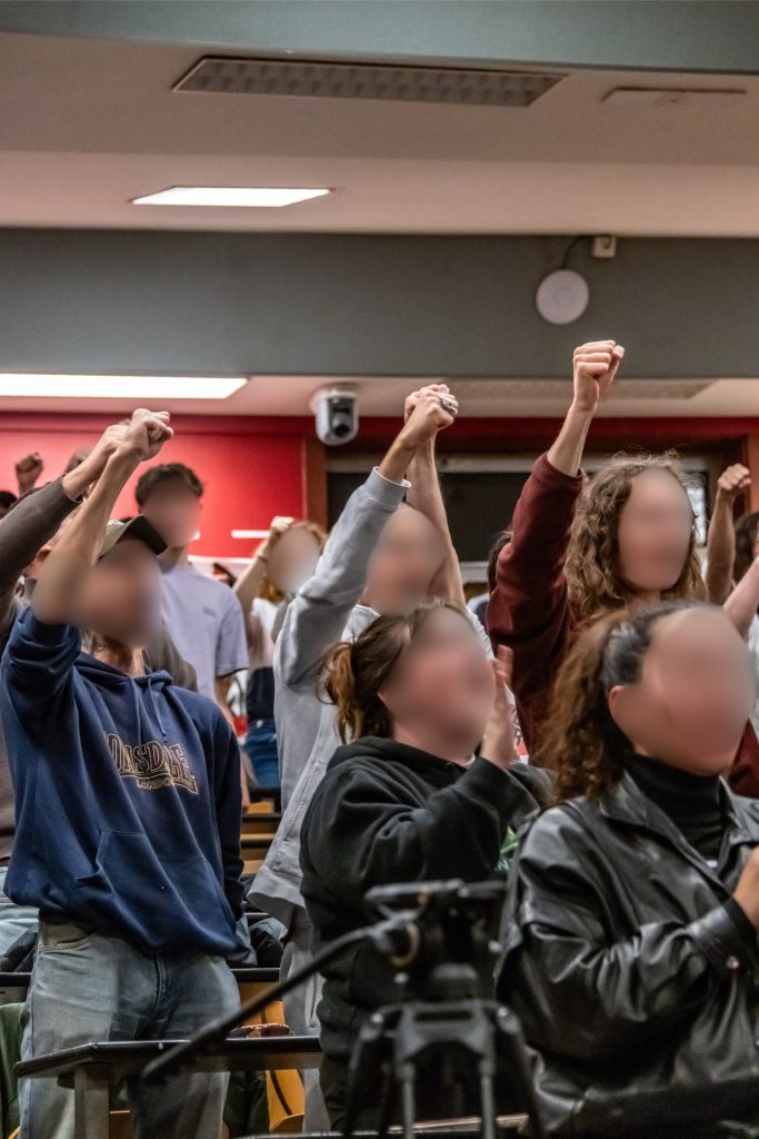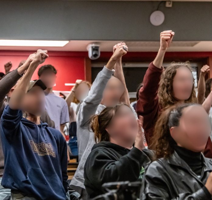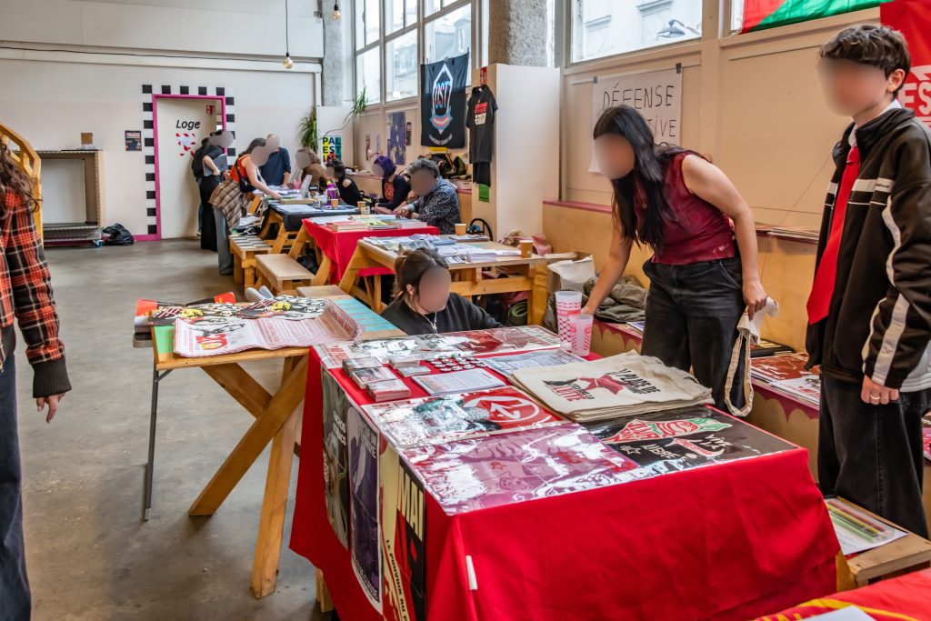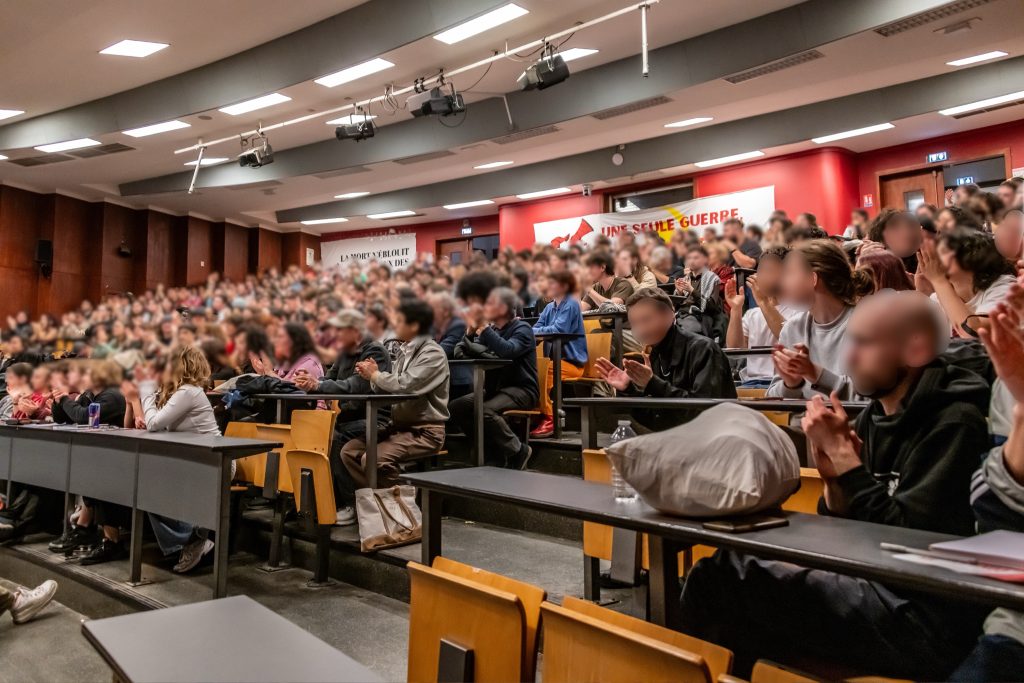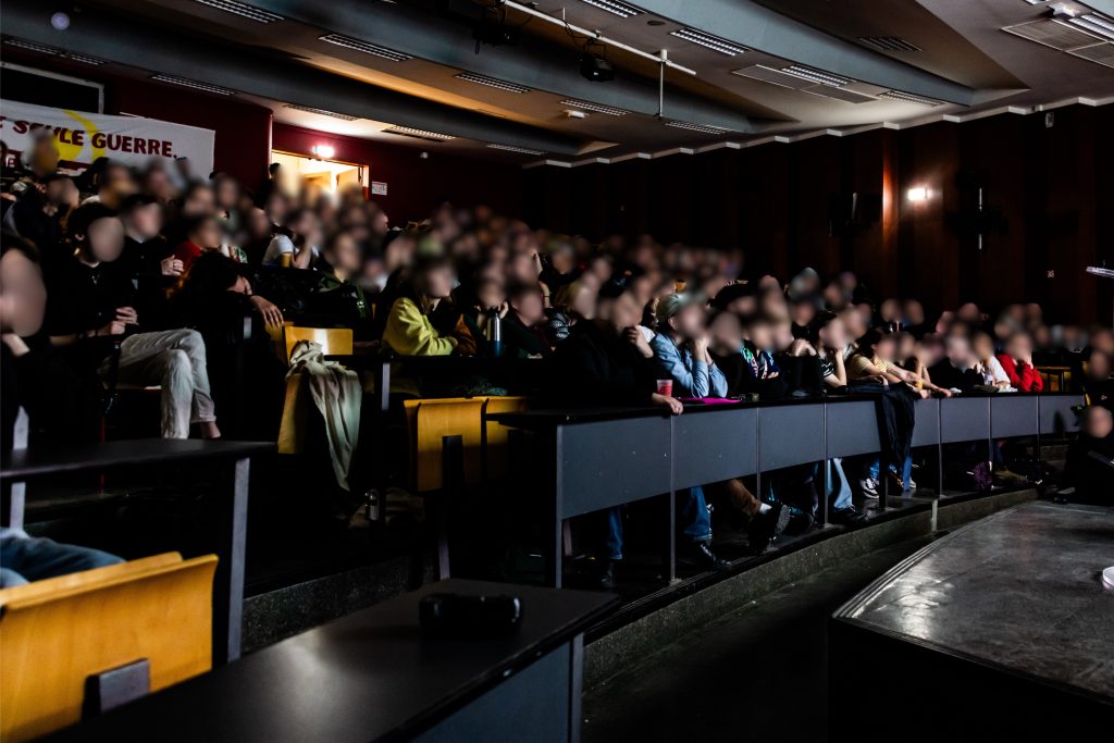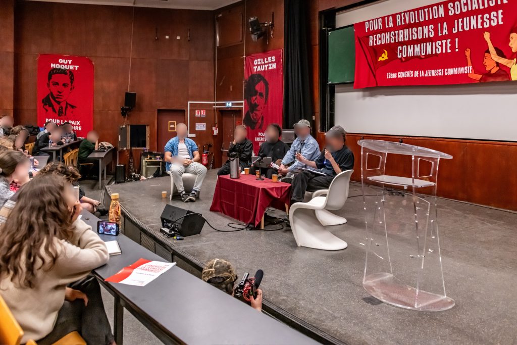 La discussion est animée par deux membres de la nouvelle Jeunesse Communiste, à l’époque participants actifs de la lutte des Gilets Jaunes, respectivement à Saint-Nazaire et Amiens. « À l’époque c’est simple, le gouvernement voulait briser nos corps, briser nos âmes, briser nos espoirs. […] Dans les leçons qu’on en tire aujourd’hui, c’est notamment l’importance de développer la question centrale qui répond aux nécessités d’organisation de la classe pour la prise de pouvoir. C’est la question de la reconstitution du Parti Communiste en France. […] C’est important de faire front commun avec toutes les fractions du prolétariat pour faire tomber le régime. » Prenant part au débat, une lycéenne de Marseille annonce à la salle que ces derniers jours, beaucoup de lycées de Marseille ont été bloqués – applaudissements retentissants de la salle – mais que la violence de la police visant les jeunes a été inouïe avec 9 camarades mineurs en garde à vue, faisant le lien avec des interventions précédentes sur la transmission des pratiques d’anti-répression.